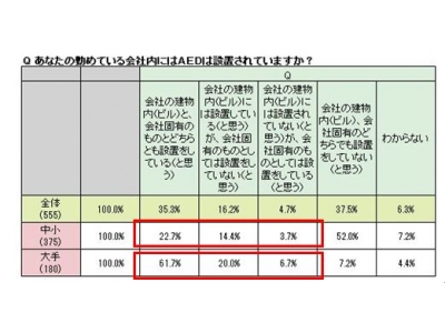 AEDに関する意識調査AED設置率、大手88.4%、中小40.8%設置していない理由上位「義務化されていないから」「きっかけがないから」企業で行う救命講習の経験率、大手44.4%、中小24.8%