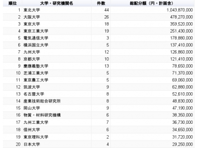 1位は東北大学。阪大、東大が続く。「人工筋肉/ソフトアクチュエータ」市場における科研費獲得金額ランキングTOP50