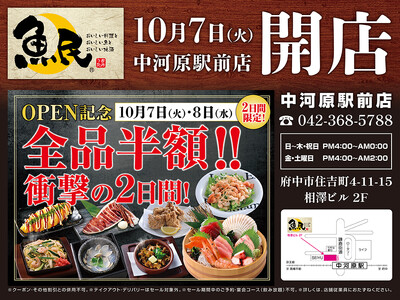 【リニューアルオープン】東京都府中市の「豊後高田どり酒場 中河原駅前店」が「魚民 中河原駅前店」として2025年10月7日(火)にリニューアルオープン!2日間限定で“全品半額のオープンセール”を実施!