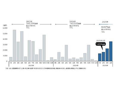 2月の食品値上げ、1656品目 2カ月連続で前年上回る 2025年の値上げ、累計8千品目突破 前年比9割増ペース