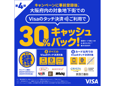 「Visa割」登録カード利用で、30%キャッシュバック!『大阪限定 Visaのタッチ決済キャッシュバックキャンペーン 第4弾』を12月3日より開始