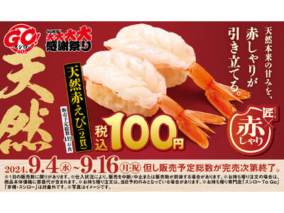 匠がこだわり抜いた赤しゃりと厳選した天然魚が一緒に味わえる『ネタの旨さを引き立てる匠の赤しゃり×天然魚』開催!「天然赤えび2貫」が全店税込100円で登場!
