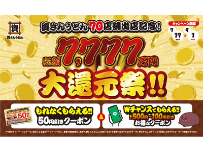 北九州のソウルフード「資さんうどん」は7/17(水)~9/1(日)の期間にて、資さんうどん70店舗出店記念、クーポン大還元祭を開催。還元総額は7,777万円!!クーポンをゲットして「資さん」へ行こう!