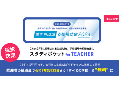 学校向け生成AIクラウド「スタディポケット for TEACHER」、経産省「働き方改革支援補助金2024」に採択決定、すべての学校で令和7年3月31日まで、GPT-4 を含め「無料」で利用可能に。