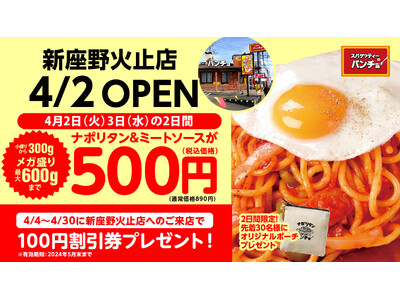 【新店OPEN】埼玉新座のみなさんに、改めてナポリタンはうまいと言わせたい! 4/2(火)『スパゲッティーのパンチョ 新座野火止店』が新規開店、オープニングキャンペーンを開催