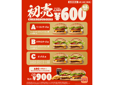 バーガーキング(R) がお得な新春初売りキャンペーンを1週間限定開催!本格チーズバーガー2個が460円引き43%オフの600円!セットで900円!あなたはスモーキーなベーコン派?チーズ4種のクアトロ派?