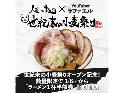 大阪行列No.1ラーメン店「人類みな麺類(大阪・南方)」を運営するUNCHI株式会社が登録者174万人YouTuber「ラファエル」と立ち上げた新店舗「世紀末の小麦祭り」のラーメン1杯半額券を配布!