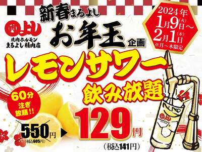 レモンサワー飲み放題破格の129円(60分)|1月9日(火)~2月1日(木)、焼肉ホルモンまるよし精肉店全店(大阪市内9店舗)で新春お年玉企画を開催