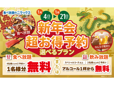 【新年の始まりはみんなでお得に食べ放題!!】1/21迄のWEB予約限定!『ニラックスブッフェ』34店舗にて“アルコール飲み放題もしくは1名様無料”の選べる特典がついた『新年会プラン』が登場!