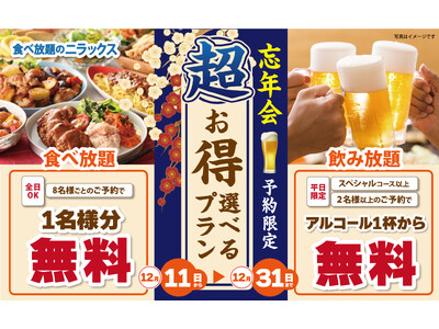 【まだ間に合う!!今年の締めくくりはお得に食べ放題!!】12/31迄のWEB予約限定!『ニラックスブッフェ』35店舗にて“アルコール飲み放題もしくは1名様無料”の選べる特典がついた『忘年会プラン』が登場!