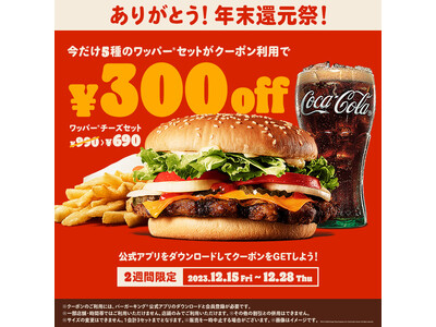 バーガーキング(R) 年末還元祭!200店舗突破の感謝を込めてワッパー(R) セット5種の300円引きクーポンを公式アプリで2週間限定配信!人気のチーズ・ダブルチーズ・BBQ・テリヤキ・スパイシーが登場!
