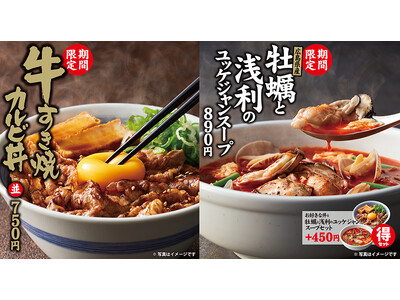 【焼きたてのかるび】11月21日(火)より冬期間限定で「牛すき焼カルビ丼」と「牡蠣と浅利のユッケジャンスープ」を販売開始