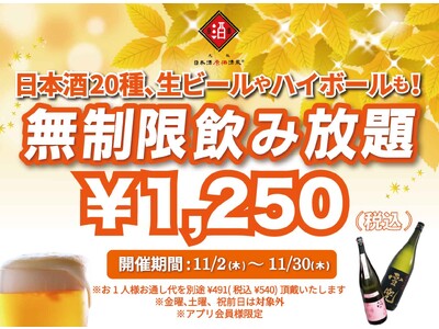 時間無制限(最大11時間)日本酒飲み放題¥1,250(税込)|日曜~木曜日、1日30名様限定┃11月2日~30日、日本酒原価酒蔵で開催