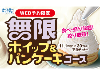 【盛り放題!!絞り放題!! 無限にホイップクリーム&パンケーキ食べ放題!! 】11/30迄の平日ディナー予約限定!ニラックスブッフェ2店舗にて無限に食べ放題で堪能!『無限ホイップ&パンケーキコース』が登場!