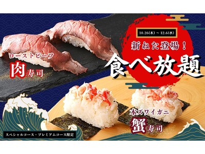 【食欲の秋は“蟹寿司”食べ放題で決まり!!】12/6まで!『ニラックスブッフェ』23店舗のスペシャルコース以上にて、本ズワイガニをふんだんに乗せた『蟹寿司』と肉の旨みが堪能できる『肉寿司』が登場!