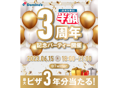 ドミノ・ピザ、大ヒット「お持ち帰り半額TM」が6月15日で発売3周年 絶対1万人以上に「おめでとう」と祝ってほしい! 「『お持ち帰り半額TM』祝3歳!Twitterキャンペーン」開催!