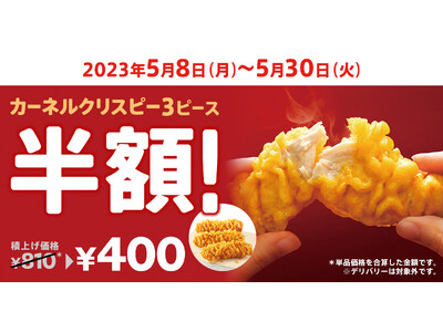 【今回はなんと23日間!】大人気サイドメニューが今だけ410円もおトク!「カーネルクリスピー3ピース半額」キャンペーンが5月8日(月)から5月30日(火)で実施