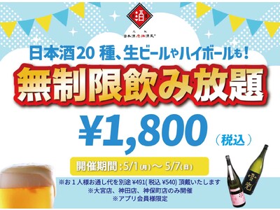 時間無制限(最大11時間)日本酒飲み放題¥1,800(税込)|1日30名様限定┃5月1日~7日、日本酒原価酒蔵 大宮店、神田店、神保町店で開催