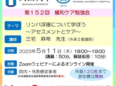 【岡山大学】岡山大学病院 第152回緩和ケア勉強会「リンパ浮腫について学ぼう~アセスメントとケア~」〔5/11,木 オンライン開催〕