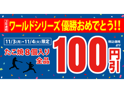 【 祝!2連覇!!】ドジャース2年連続WS優勝を祝い、明日より 『たこ焼(8個入り)全品100円引き』!