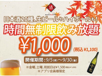 時間無制限(最大11時間)日本酒飲み放題¥1,000(税込¥1,100)|1日30名様限定┃9月5日~30日、日本酒原価酒蔵全店で開催┃金土祝前日は¥1,500(税込¥1,650)