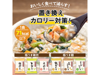 【新発売】美味しく食べてカロリーを減らすうれしいダイエットサポート食「カロリースマート 極うま雑炊・極うま麺」。カロリーをたったの71kcal以下に抑えた、具だくさんの雑炊3種と麺3種。
