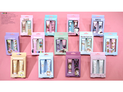【サンリオやクレヨンしんちゃんなど人気キャラクターが大集合】シアバター配合で2種類の香りがセットになった大人気キャラクターハンドクリームの新デザイン13種類が新発売!