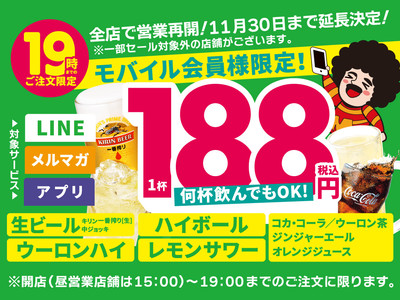全店で通常営業を再開!全国的にお酒の提供が可能になったことを受けてモバイル会員様限定「ドリンク1杯188円タイムセール」を11月末まで延長!