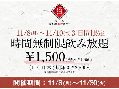 日本酒時間無制限飲み放題¥1,500(税込¥1,650)┃11月8日(月)~10日(水)に3日間限定で日本酒原価酒蔵全店で開催┃11月11日~30日は¥2,500(税込¥2,750)より