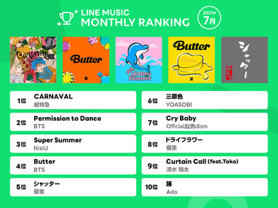【LINE MUSIC 月間ランキング7月 】今年の夏最も熱いサンバ、超特急「CARNAVAL」が1位!2位BTS「Permission to Dance」、3位NiziU「Super Summer」