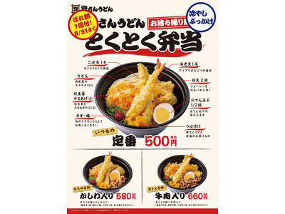 「資さんうどん」は、冷たいうどんと天ぷら等各種おかずが大好評の「とくとく弁当」に名物「ぼた餅」を期間限定で1個プレゼント!「とくとく弁当」と「ぼた餅」を食べて、日々のモヤモヤを吹き飛ばしましょう!