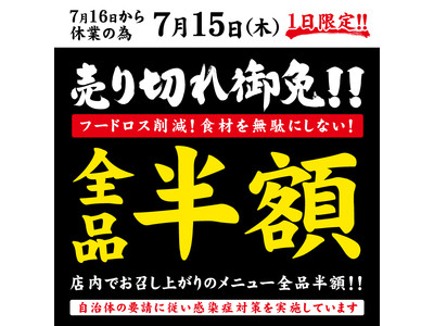 【食材を無駄にしない】日頃の感謝の気持ちを込めて、「売り切れ御免!全品半額セール」を実施いたします